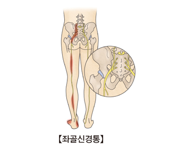 척추와 척추 사이의 디스크가 튀어나와 다리로 가는 신경을 눌러 심한 통증과 감각 및 근력 저하를 유발하는 질환을 추간판 탈출증이라 하는데, 이로 인해 다리 뒤쪽으로 뻗치는 통증을 유발하여 좌골 신경통이 발생합니다. 좌골 신경이 영향을 받으면 허리에서 시작하여 엉덩이, 허벅지, 발까지 쑤시거나 타는 듯한 통증이 발생하며, 침범한 다리의 저린감, 무감각, 근력 약화 증상까지 발생할 수 있습니다. 많은 경우 침상안정이나 재활운동 및 약물치료로 증상이 호전되기도 하지만, 증상이 계속 지속되거나 진행하는 환자의 경우 신경차단술 등의 시술을 시행하기도 합니다. 양 하지에 힘이 빠지거나 증상이 심하면 수술적 치료가 필요할 수 있습니다.