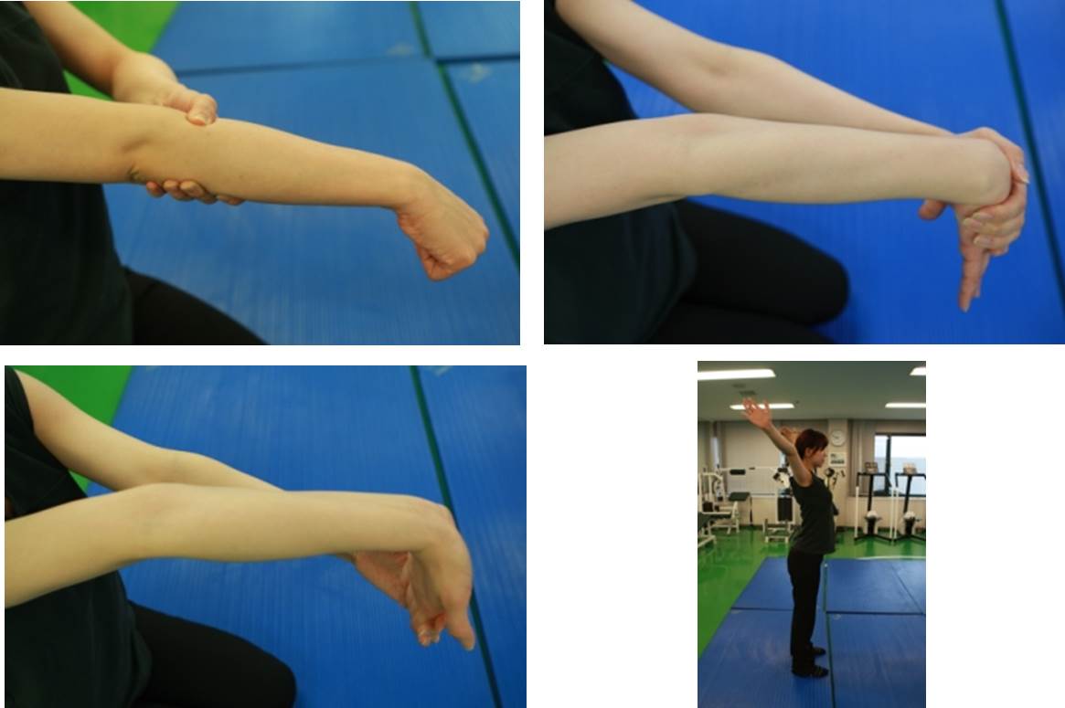손등이 위로 향하도록 팔을 앞으로 편 상태에서 팔꿈치 바로 아래 가장 두꺼운 부위 근육을 반대 손으로 강하게 누릅니다. 근육이 약간 뻐근할 정도로 눌려진 상태에서 손목을 천천히 돌립니다. 10회를 반복하고, 3~5세트 시행합니다.