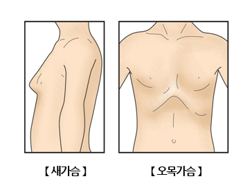 복장뼈가 정상보다 과도하게 앞으로 돌출된 형태의 가슴을 새가슴이라 하며, 유아기에 구루병을 앓은 경우 새가슴이 나타날 수 있습니다. 반대로 흉골이 안쪽으로 당겨진 것처럼 가슴의 한가운데가 움푹하게 패인 형태의 가슴을 오목가슴이라 하며, 이는 앞가슴벽의 가장 흔한 선천성 기형입니다.