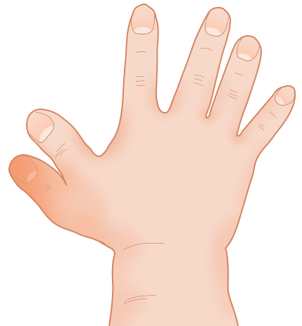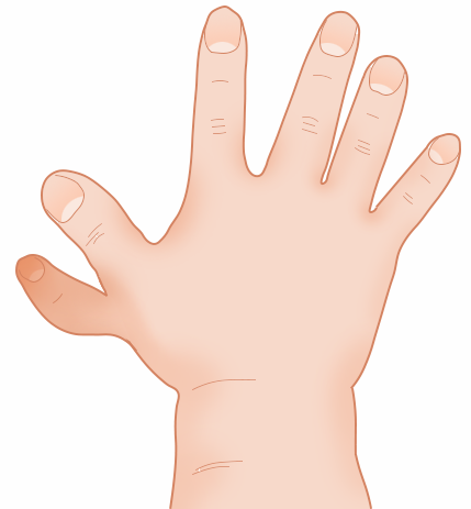 한쪽 손에 손가락이 여섯 개 이상일 때 다지증이라고 합니다. 손에 가장 많이 나타나는 선천성 기형입니다. 백인과 흑인에서는 대략 생존 출생 10,000명당 1명 정도가 다지증인 것으로 보고되지만, 아메리카 인디언이나 우리와 같은 몽골족에서는 이보다 흔하게 4,000~5,000명 중 1명 정도로 나타난다고 합니다. 다지증의 85%는 엄지손가락에 발생하지만 새끼손가락에 발생하기도 합니다.