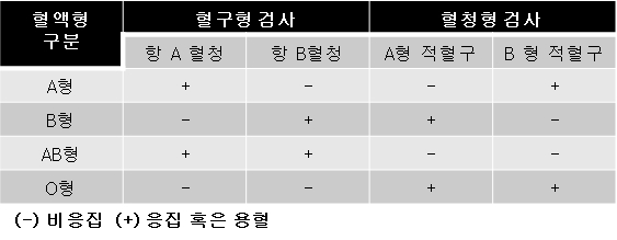 Anti-A와 anti-B가 각각 해당되는 A항원 및 B항원과 체내에서 만나면 적혈구를 파괴시키는 용혈현상이 발생하지만, 체외에서 검사를 시행할 때에는 육안으로 관찰 가능한 적혈구의 응집현상이 일어납니다. ABO 혈액형 검사는 이러한 적혈구의 응집반응을 원리로 이용하여 이루어지는데, 혈구형 검사와 혈청형 검사 두 가지 방법으로 시행됩니다. 혈구형 검사에서는 검사 대상자의 적혈구를 anti-A 및 anti-B 시약과 반응을 시키고, 혈청형 검사에서는 검사 대상자의 혈청(혈액 내의 세포 구성물을 제외한 액체 성분)을 A형 및 B형 혈구 시약과 반응을 시켜 각각의 응집 여부를 확인하여 혈액형을 판정합니다.