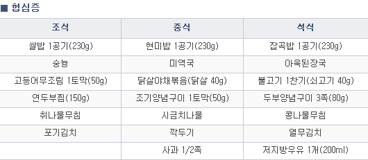 1. 밥은 현미, 보리 등을 섞은 잡곡밥이 좋으며 기호에 따라 적정량 혼식합니다. 단, 입맛에 맞지 않을 경우 무리하게 잡곡밥을 고집하지 말고 쌀밥을 섭취합니다.