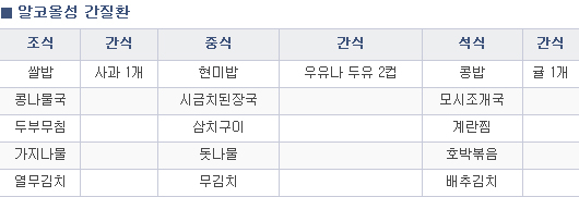 밥, 감자, 고구마, 떡 등의 곡류 식품, 양질의 단백질 식품( 살코기, 생선, 두부, 계란 , 콩 등),채소, 과일