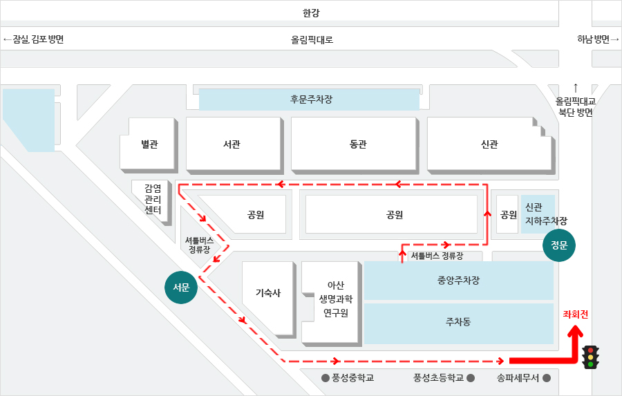 송파세무서 전 우회전 → 풍성중학교 앞 우회전